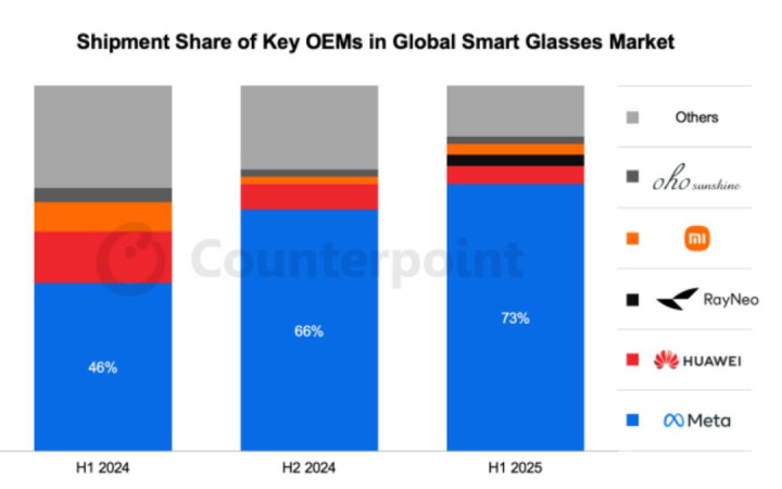 高通最大的AR1客户Meta,其在全球智能眼镜市场的份额在今年上半年上升至73%。根据该市场研究公司本月早些时候发布的一份报告,该市场规模与2024年同期相比增长了一倍以上。